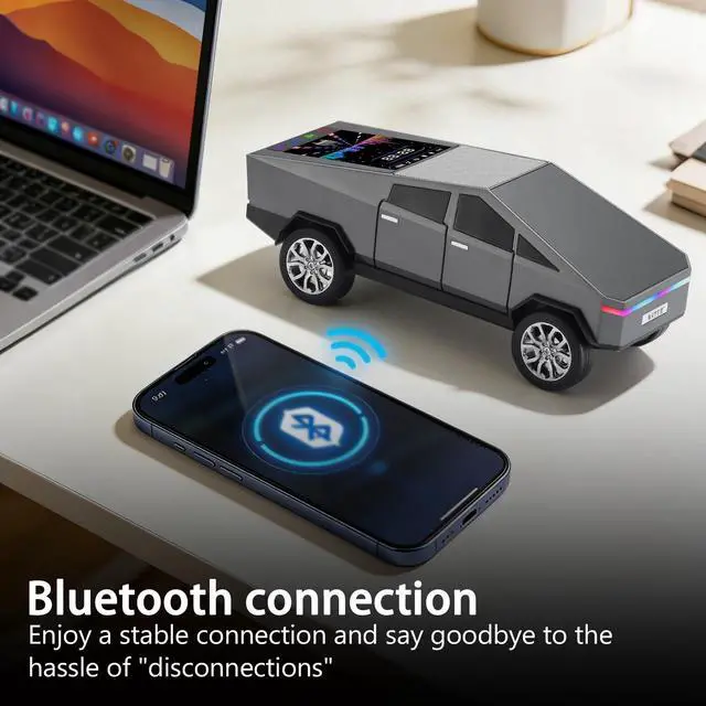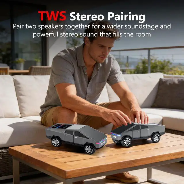 Futuristic Truck Design + Display Screen Inspired by modern electric trucks, this eye-catching speaker features a dynamic display that enhances both looks and usability. ^^ HD Sound & TWS Pairing Enjoy rich, clear audio solo or pair two WS-580 units for a stereo experience with True Wireless Stereo (TWS) function. ^^ Multi-Source Music Playback Stream via Bluetooth or play your favorite tracks using a USB flash drive, TF card, or built-in FM radiomusic anytime, anywhere. ^^ Hands-Free Calling + Built-in Mic Take calls directly through the speaker without reaching for your phone, ideal for multitasking at work or while relaxing.