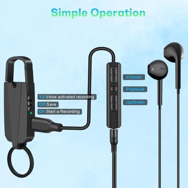 Use: Simply push OnorOff to start recording, switch to VA to turn on Voice Activation feature. By inserting headphones into the jack of the converter and connect the USB-C port of the listening device, you can playback recordings or adjust volume. This handheld recorder can be easily used by the aged, adults or children ^^ Portable and