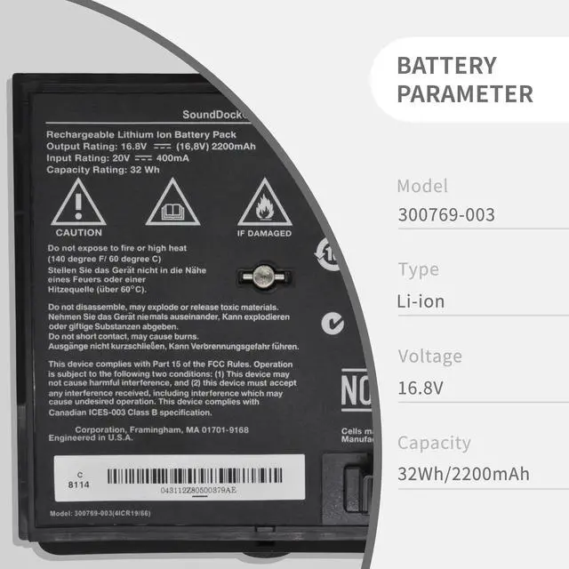 Capacity: 32WH/2200mAh ^^ Compatible P/N300769-001, 300769-002, 300769-003, 300770-001, 300769-004, 4ICR19/66. ^^ Compatible Models For Bose Sounddock Portable Digital Music System SoundLink Air Series ^^ DG QualityGrade A cells mitigate the risk of battery leakage and maximize output stability. Built-in circuit protection, enhances safety of usage and extends battery life. ^^ DG TIPSFor the initial installation, please reinstall and check the interface fully connected, discharge the battery to 5%(not to 0%) and then charge to 95%, and cycle 3-4 times.