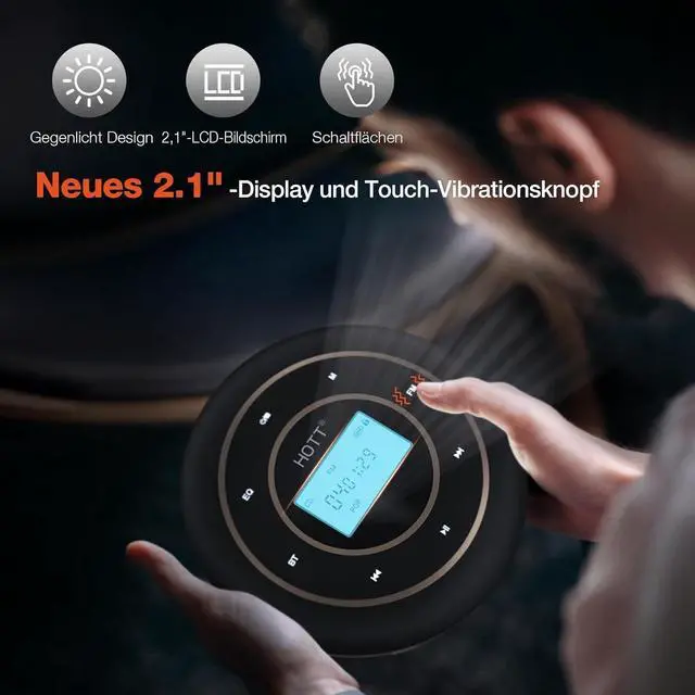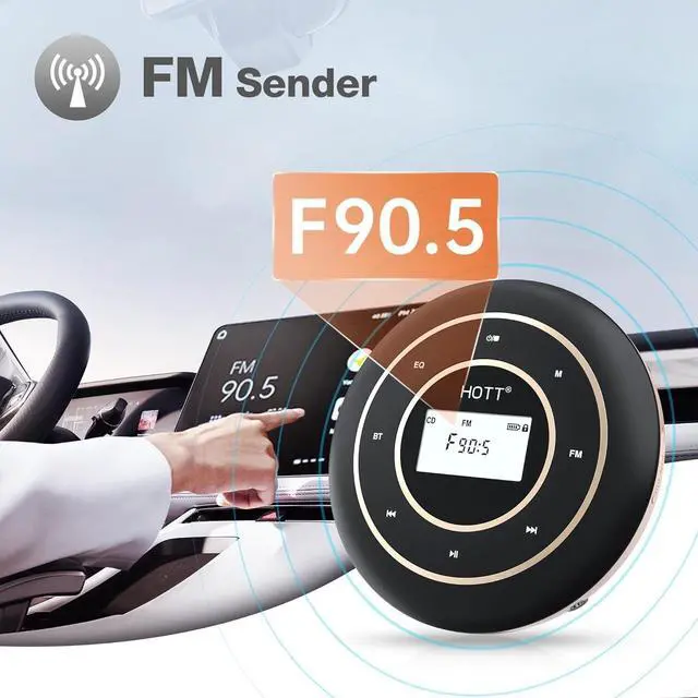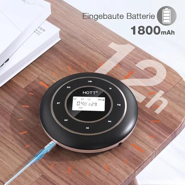 1800mAh Rechargeable BatteryThis portable CD player has a built-in 1800mAh Li-ion battery, no need to use AA batteries or always plug the charging cable into the cd player when playing music. It gets fully charged in about 4 hours with included USB charging cable and last more than 12 hours when playing music at medium volume ^^ FM TransmitterThe Rechargeable CD player portable provides a more rapid and stable and FM connections, it's can be easily paired with most of car stereo or wireless earphones ^^ Touch Buttons and Blacklight DisplayHOTT CD Player is the newest design with sensitive touch buttons and backlight display.