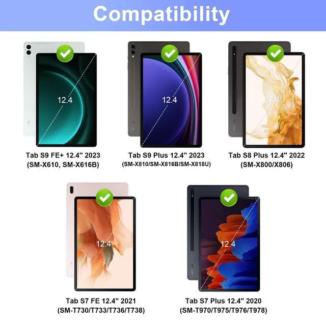 Compatibility: Designed for Samsung Galaxy Tab S10 Plus 12.4 '' 2024 (SM-X820/ X826B/ X828U), Tab S9 FE+ 12.4" 2023(SM-X610, SM-X616B), Galaxy Tab S9+ 2023 (SM-X810/SM-X816B/SM-X818U), Galaxy Tab S8+ 2022 (SM-X800/SM-X806), Tab S7 Plus 2020 (SM-T970/T975/T976/T978), Galaxy Tab S7 FE 2021(SM-T730/T733/T736/T738).