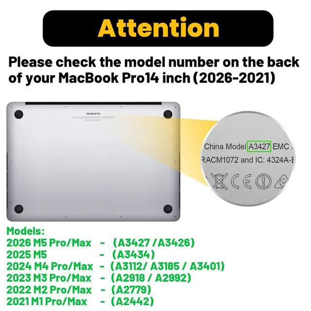 Compatibility: Designed exclusively for MacBook Pro 14 inch case M5 M4 M3 M2 M1 Pro/Max 2026 2025 2024 2023 2022 2021, Model: A3427 A3426 A3434 A3112 A3185 A3401 A2918 A2992 A2779 A2442. Pls verify Model No. the underside of computer before buying ^^ Seamless
