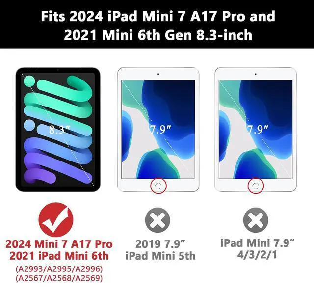 Compatibility- Designed for iPad Mini (A17 Pro) 7th Generation 2024/ Mini (A15 Bionic) 6th Generation 2021 Release Model Number(A2996/A2995/A2567/A2568/A2569).NOT compatible with any other devices.