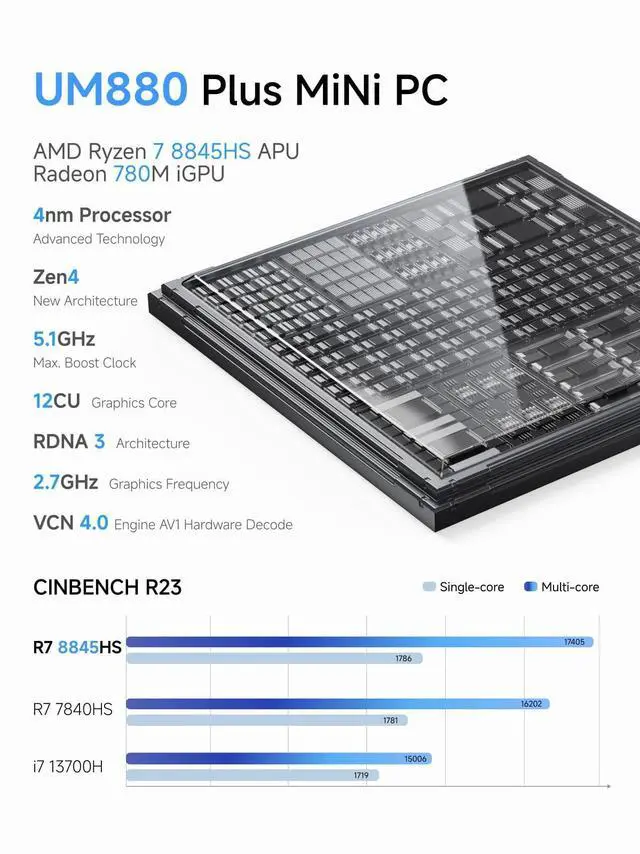 Ryzen 7 8845HS ProcessorMINISFORUM UM880 Plus Mini PC is equipped with AMD Ryzen 7 8845HS processor, an ultra-thin processor manufactured using 4nm process, 8 cores, 16 threads, the standard clock speed is 3.8GH z, and the max. Boost clock up to 5.1 GHz. ^^ Powerful GraphicsThe UM880 Plus Mini Desktop computer features the latest Zen 4 architecture. Cinebench R23 shows up to a 14% improvement in single-core performance compared to the previous generation Zen 3+ architecture. Featuring the AMD Radeon 780M(12 core 2.7GH z) with the revolutionary AMD RDNA 3 architecture, the performance is almost as close as that of the GTX 1650 discrete graphics cards, offering excellent graphics processing power for multitasking and gaming needs.