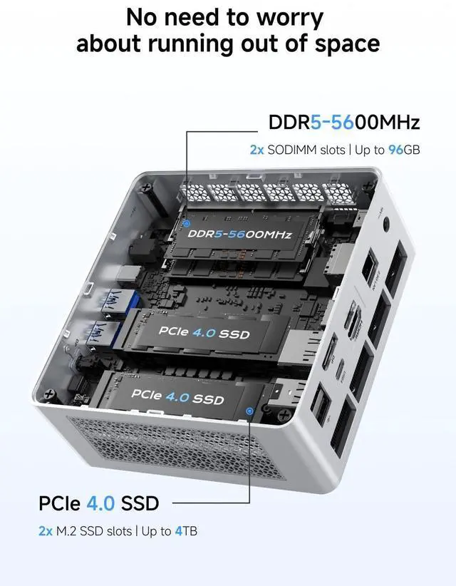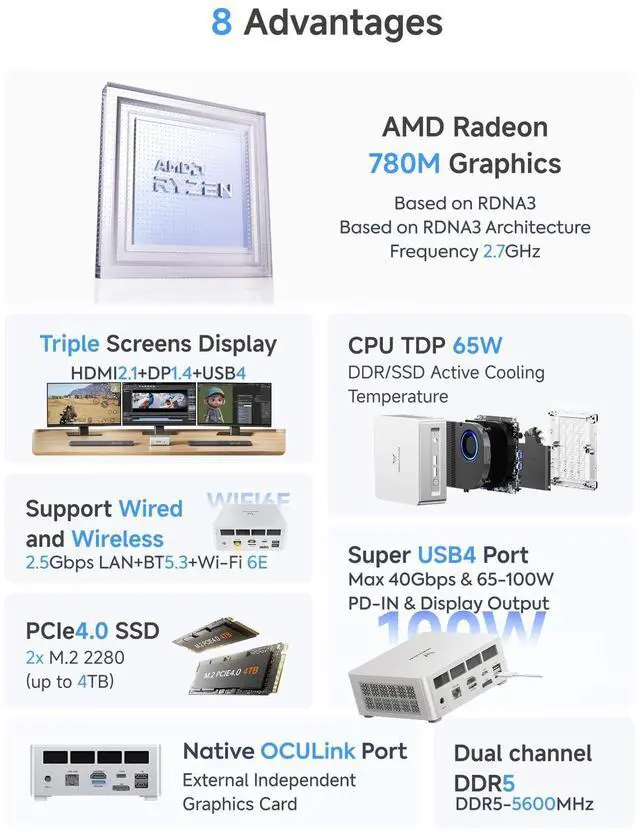 Note: *Non-hot-swappable, OCuLink requires one M. 2 2280 PCIe 4.0 SSD slot*. ^^ Expandable StorageThe UM880 Plus Barebone Mini PC supports DDR5-5600MHz (dual SO-DIMM slots) and offers up to 96 GB of storage. It features dual M. 2 2280 PCIe 4.04 slots, supporting up to 2TB per SSD (totaling up to 4TB). You can customize it as you like without worrying about capacity, watch and store large-scale movies and photos without stress. ^^ Triple Display OutputThis Mini Computers is equipped with HDMI 2.1 (8K@60Hz ^^ 4K@120Hz), USB4(8K@60Hz ^^ 4K@120Hz), and DisplayPort 1.4 (4K@120Hz) display outputs, you can connect three independent displays at the same time to meet the demands of daily multitasking. Increase your productivity by expanding multiple workspaces. ^^ Full-featured USB4& Fast NetworkThe USB4 full-featured port provides a 4K@60Hz video output display that supports up to 40 Gbps transfer speed, and 65-100W adapter PD-IN input. You can also drive a 15W mobile display with a single cable via the USB4 interface. UM880 Plus Mini PC has a 2.5G bps LAN wired network port and Wi-Fi 6E/BT 5.2 wireless network card, providing a stable network connection and fast transmission speed.