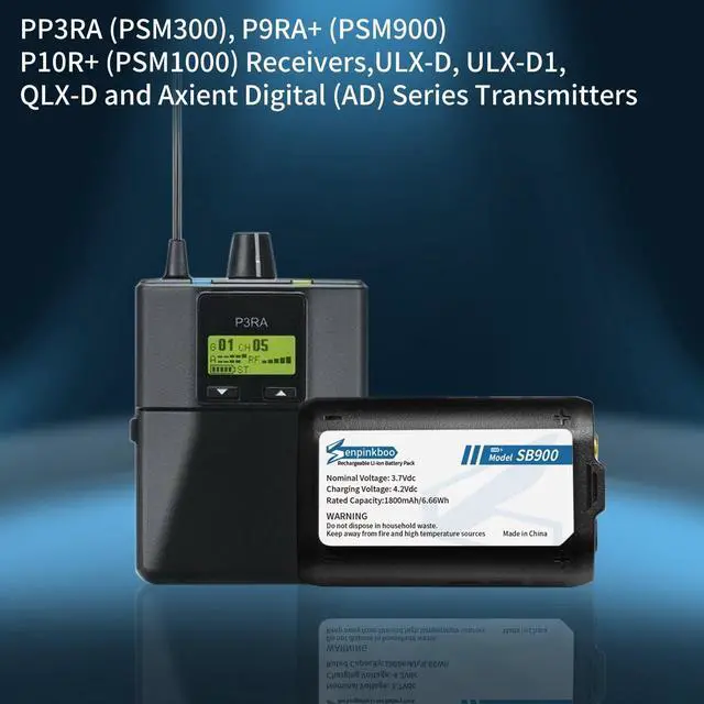 Compatible Model: This Replacement Battery model is SB900 SB900A SB900B SB900C. Compatible with P3RA P9RA+ P10R+ Receivers ULX-D QLX-D and AD Series. please carefully examine your device model and old battery if it fits before purchasing. ^^ HIGH QUALITY GRADE A PREMIUM BATTERY: Each SB900 battery is tested to strict quality control standards and includes a built-in IC chip to prevent overcharging, overheating, and other defects. You can choose it with confidence.