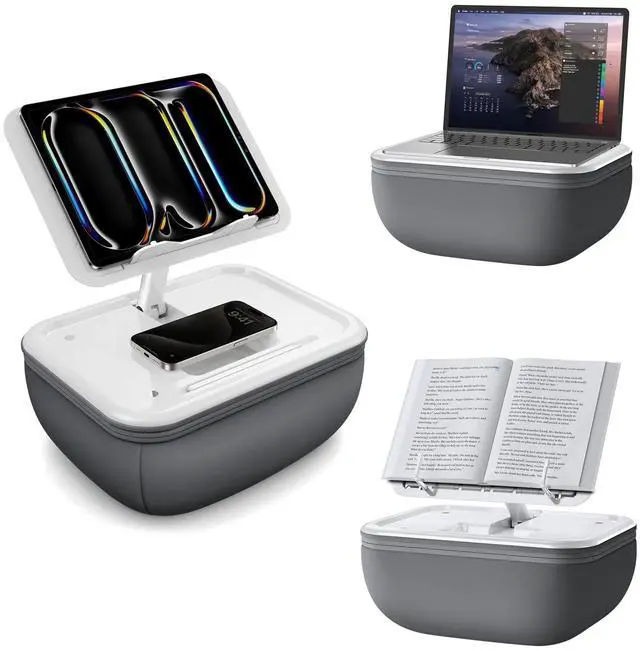 Multifunctional Soft Pillow Padelitehood tablet pillow stand for lap provide the best way to hold up your tablet, kindle or book while sitting or lying down on the sofa, recliner, bed, chair, couch, car and etc. iPad pillow stand is built with the most comfortable elastic fabric and soft food-grade EPS foam particles. it can raise your device up to 12 inch for your best viewing and relieve neck strain. dual-axis design allows users to adjust the angle and height without limit. ^^ Wide CompatibilityThe soft pillow stand for lap is compatible with all laptops and tablets from 4.7" up to 15.6", including popular models like MacBook, MacBook Air, MacBook Pro, 2024 iPad Pro/Air 13/11, iPad Pro 11/ 12.9 inch, iPad Air, iPad Mini, iPad 8th/ 9th/ 10th generation, Kindle Fire HD 7 8 10, E-reader, Surface Pro, Galaxy Tab S8, S7, A8, A7, Switch, magazines, books and more! ^^ Adjustable Angles & HeightThe design of 2 rotating shafts allows this bed iPad holder to be adjusted in multiple dimensions, including any angle and appropriate height, support both horizontal and vertical viewing.