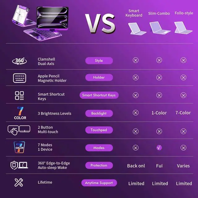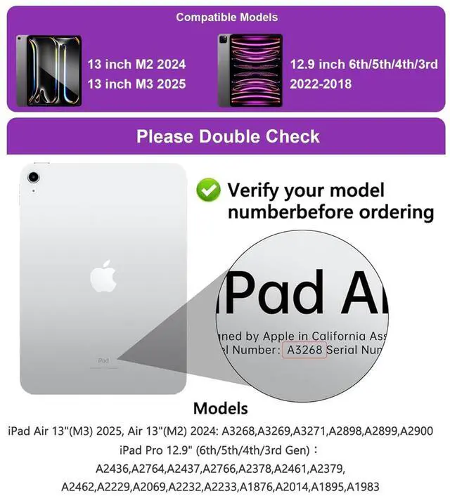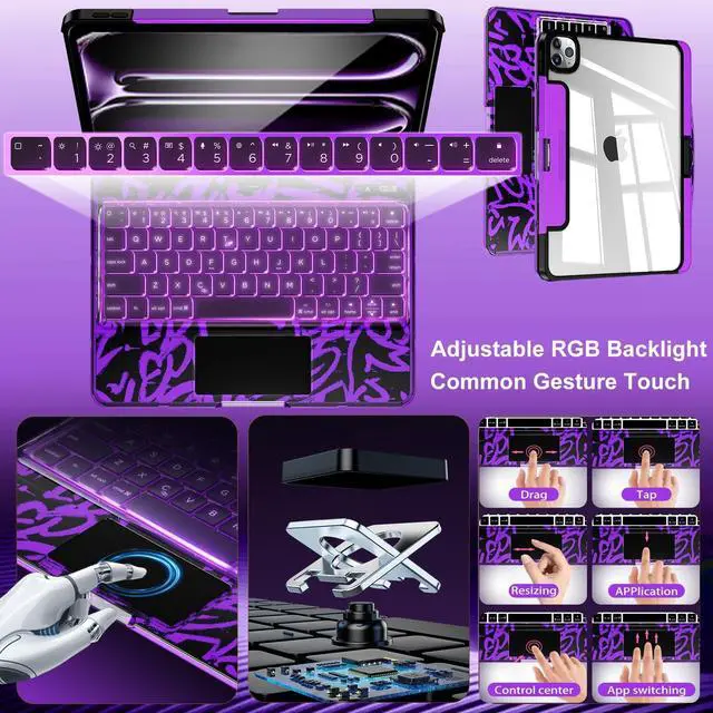 Pro 12.9" (2022/2021/2020/2018): A2898, A2899, A2900, A3268, A3269, A3271, A2436, A2437, A2764, A2766, A2378, A2461, A2379, A2462, A2229, A2069, A2232, A2233, A1876, A2014, A1895, A1983. If you are unsure about compatibility, feel free to contact uswe're happy to ass ^^ 360Rotating Stand + Built-In Pencil HolderThe 360rotating stand and 185adjustable hinge provide the perfect angle for typing, drawing, watching videos, gaming or reading. The transparent shock-resistant shell protects your device from drops and scratches, while the magnetic pen slot keeps your Apple Pencil secure. ^^ 7-Color Backlit Wireless KeyboardThis wireless iPad keyboard includes 7 vibrant backlight colors and adjustable brightness levels, making it easy to type in low-light environments like airplanes, classrooms, and late-night work sessions. ^^ Fast Charging & All-Day Battery LifeiPad keyboard fully charges in just 2 hours and delivers long-lasting performance for work, study, and travel. Enjoy a keyboard case that stays powered and ready whenever you need itwithout the hassle of constant recharging. ^^ Precision Multi-Touch TrackpadExperience smooth, accurate control with a multi-gesture touchpad that brings a true laptop-style experience to your transparent keyboard case for iPad.