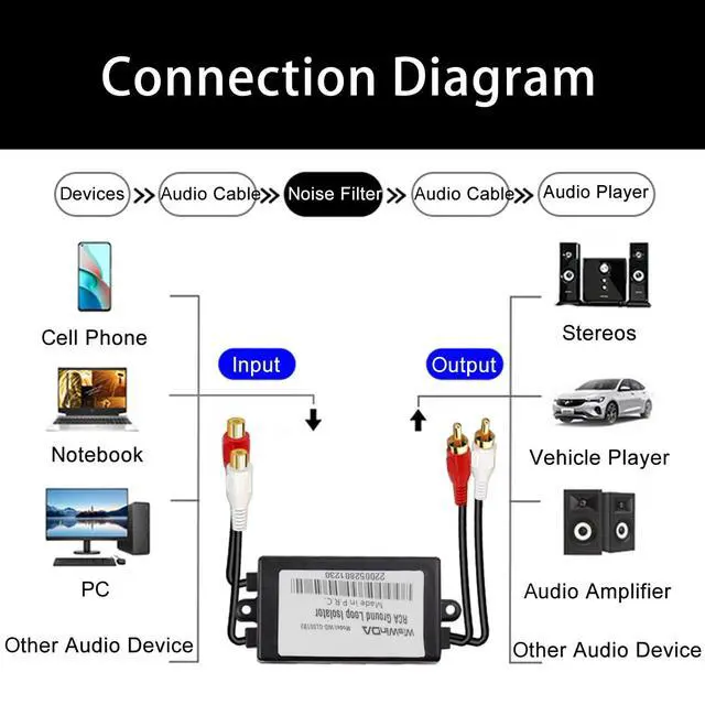 ^^ 4. HiFi Performance--The Ground Loop Audio Noise Eliminator could work with car stereo, amplifiers, speakers or mixers, with stable performance, high precision and good reliability. Let you eliminate car speakers / home stereo systems humming sound away and enjoy a perfect sound. ^^ 5. Wide Application-- Audio Noise Isolator Filter for Eliminating ground loop noise between the audio source and radio. Used for portable devices that have RCA audio outputs Home Stereo Speakers Amplifier Equalizer ect.