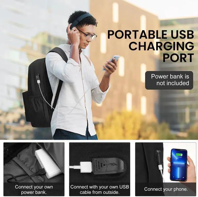 USB Charging Port Design: With an External USB charging port & set-in charging cable, this USB laptop backpack offers you a more convenient way to charge your phone while on the go. (Power bank NOT included).