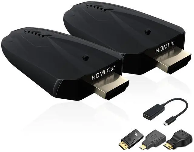 include: 1 x 4k Type-C to HDMI Adapter (newly added) + 1 x 4k DP to HDMI Adapter + 1 x Mini HDMI to HDMI Adapter + 1 x micro to HDMI Adapter+, it will be more convenient connection and adaptation for all kinds of product such as camera, DP port computer, tablet etc. ^^ Versatile Wireless Streaming HDMI Kit with Superior ClarityThis Wireless HDMI Extender ensures smooth, reliable, and hassle-free streaming without the need for messy cables, WiFi, Bluetooth, or apps. Effortlessly connect your PC, laptop, TV box, Mobile phones, Tablets and other devices to TVs, projectors, and displays using this wireless HDMI transmitter and receiver, providing high-quality visuals with zero latency on larger screens. Enjoy seamless and dependable wireless streaming with the wireless HDMI transmitter and receiver. ^^ 4K HD Quality Input and 1080P/60HZ OutputThe Wireless HDMI Transmitter and Receiver supports 4K decoding and delivers ultra-high-definition output at 1080P/60Hz, ensuring exceptional visual experiences for business meetings, education, professional presentations, family events, and gaming. Please note, this wireless HDMI extender only supports 4K/30Hz and lower for decoding.