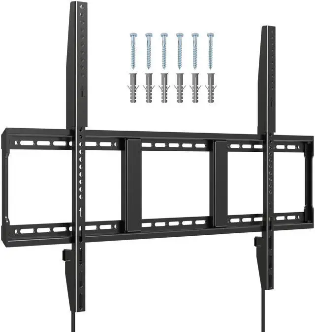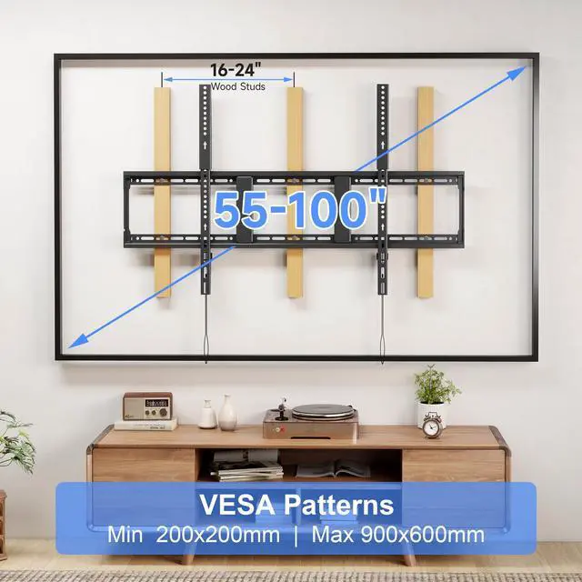 Compatible with most 55"-100" flat/curved TVs (OLED/LCD/LED/Plasma), supporting VESA up to 900x600mm ( 35.4" x 23.6" ). Always verify your TVs VESA pattern, weight, stud spacing, and input clearance before purchase. ^^ This TV wall mount securely holds oversized TVs weighing up to 265 lbs, thanks to its high-quality steel construction. Built with advanced auto-welding robot technology, it ensures exceptional strength and durability for long-term use. ^^ The low-profile mount keeps your TV just 1.3 inches from the wall, maximizing space efficiency. Its unique strap design allows easy locking/releasing, while the anti-drop mechanism ensures secure mounting for added safety.