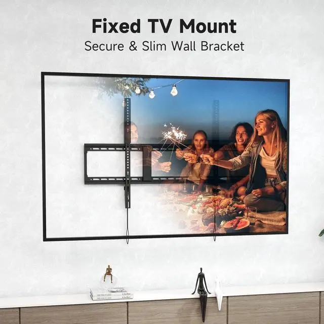 ^^ Installing this TV bracket takes less than 30 minutes with the included clear instructions. It comes with all necessary hardware and fits 16" / 18" / 24" wood studs, concrete, or brick walls (Not for drywall). ^^ This fixed-position TV mount ensures a rigid, ultra-slim profile (just 1.3" from the wall). The extended wall plate allows easy horizontal adjustments to perfectly center your TV, delivering a seamless viewing experience.