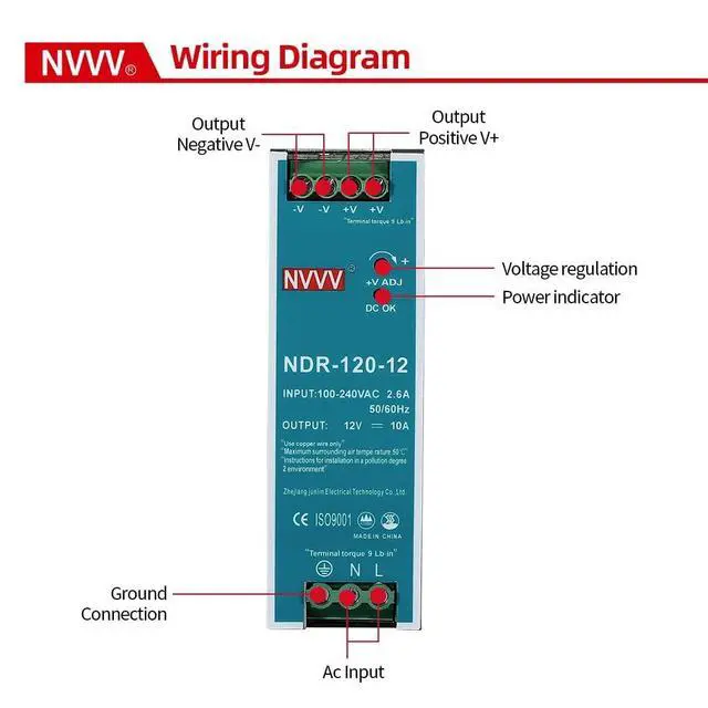 Model: NDR-120-12 ^^ Primary Output Voltage (VDC): 24V ^^ Output Current (Amps): 10A ^^ Input Voltage (VAC): 85 to 264VAC ^^ Easy to install: For DIN-rail Power Distribution Boxes