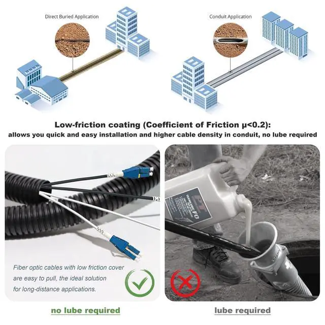 Low Friction LC/PC-LC/PC singlemode duplex fiber optic patch cable: Bangun OS2 fiber patch cable body is made of Ultra Low Friction flame retardant LSZH jacket (Coefficient of Friction < 0.2 ). Low Friction Cables are the ideal solution for wiring premises. The stiffness allows the cable to be installed by pushing as well as by the more conventional pulling method. These cables can even be used in congested conduits. ^^ Armored Fiber Optic Cable can be used outdoor: This LC fiber jumper cable built-in a stainless steel tube inside to protect the inner core (fiber glass) from damage like pet chew. it remains all the features of a standard patch cord, but is much stronger. Pressure resist, Wear resist and Heat Resist. ^^ LC Uniboot