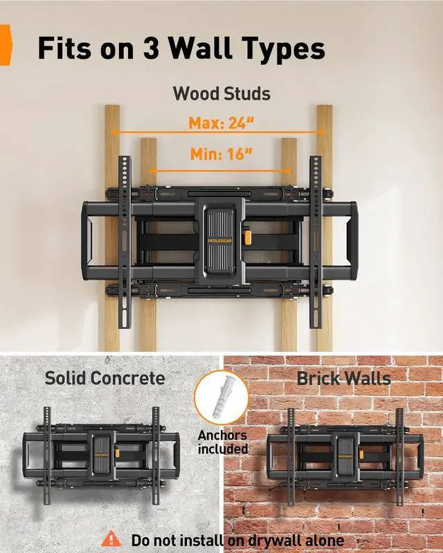 Wide Compatibility: This full motion TV mount fits most 4297 flat or curved TVs with VESA mounting patterns from 200x100 to 600x400mm. It can be installed on 16/18/24 wood studs, solid concrete, or brick walls. Do not mount on drywall alone.