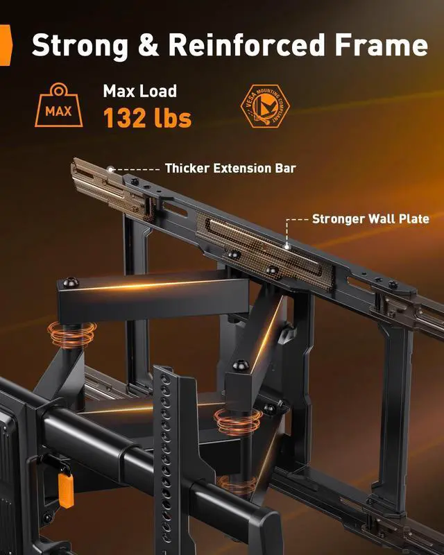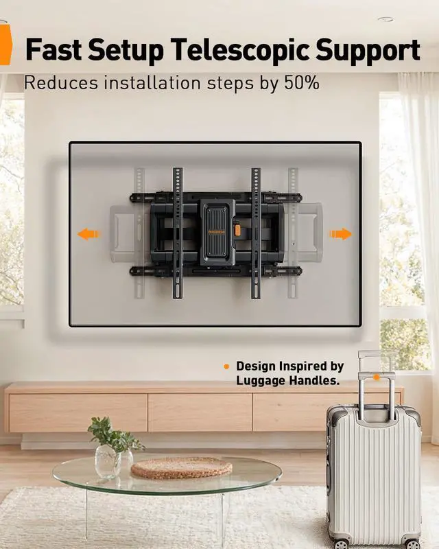 Enjoy Instant Use: The preassembled telescopic front support of the TV mount makes installation easier. After the TV brackets are attached and the arm assembly is mounted, simply pull out the telescopic front support, secure it with two screws, and your TV is ready to hang in just 10 minutes! ^^