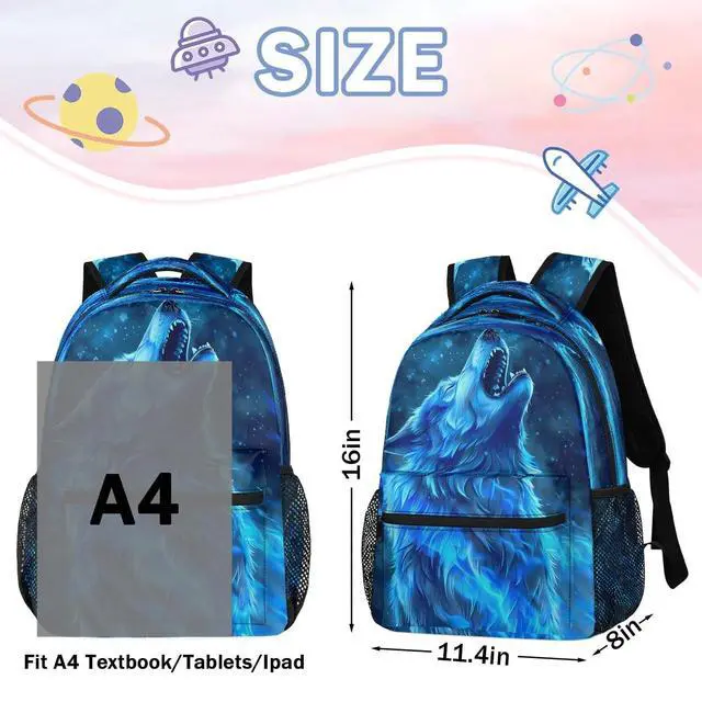 BACKPACK FOR SCHOOL: This wolf backpack are made of waterproof lightweight ultra-strong polyester, recycled material, heavy-duty and wearing-resisting. Sturdy and dual SBS zippers, quality tested to stand up to daily use. This bag owns a long life time and not easy to rip, ensure a secure and long-lasting usage every day. The empty bag is upright and the package type is stiff.