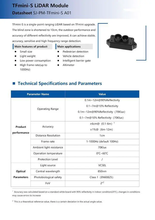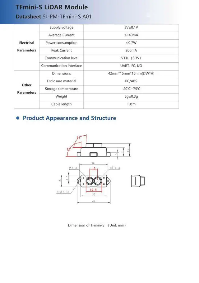 UPGRADED PERFORMANCE Based on the advanced TFmini platform, the TFmini-S LiDAR module features a reduced blind zone of only 10cm, improved outdoor performance, and enhanced accuracy across different surface reflectivities for stable, precise, and high-speed ranging. ^^ HIGH SPEED & HIGH PRECISION Achieves a remarkable frame rate of up to 1000Hz (configurable) for real-time detection. Offers high accuracy of 6cm ( 0.1 -6m) and 1% (6m-12m), with a fine resolution of 1cm, ensuring reliable data for demanding applications. ^^ FLEXIBLE & DUAL OUTPUT Supports both UART (TTL 3.3V ) and I2C communication interfaces, easily configurable via command.