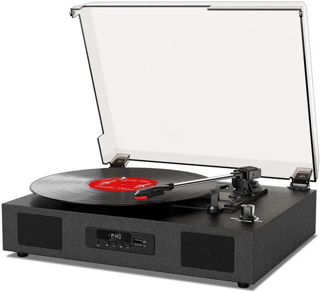 With portable size and 5V/1A power allow you take it on the go. ^^ Auto-Stop & Dust Cover-The turntable stops automatically after playing up a record, no scratch as from non-stop turntables. Removable dust cover shields your record player from dust and moisture, easy to clean and sleek for home decorations. ^^ Ideal Stylish Gift- Easy to set up, black modern look with display panel, makes it a great record player for beginners or perfect gift for music lovers. (30-days money-back or replacement & 24H customer service. )