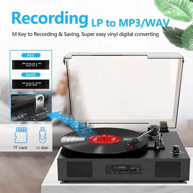 All-in-one Record Player - DANFI AUDIO record Player supports all 3-speed 3-sizes turntable (33, 45, 78RPM) to play all 7", 10"& 12" vinyl records, with built-in stereo speakers with more powerful and louder sound to revive the retro music of your albums. ^^ Bluetooth Music Input - Stream music wirelessly from your phones/tablets to turntable's built-in speakers. Use RCA output jacks to connect record player with your externally powered speakers or home audio system. (BT input Only, Cannot connect to Bluetooth speaker) ^^ Recording Vinyl to USB Flash Drive- Just plug in your USB flash drive, directly convert your records into digital files and backup in your USB drive/SD card.