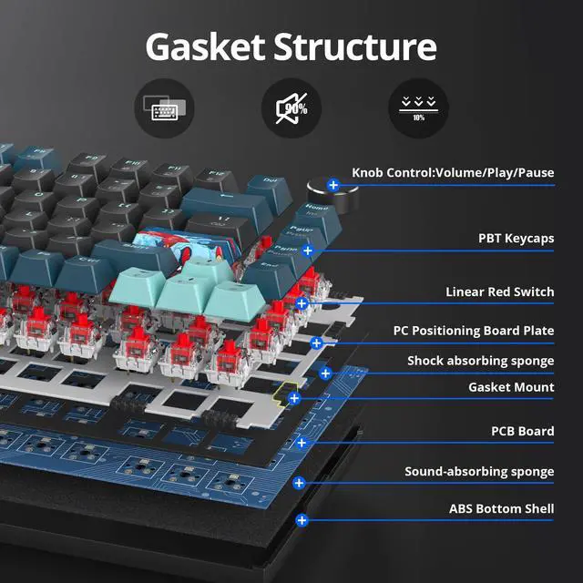 ^^ Gasket Mount KeyboardThe linear keyboard is designed with the most advanced Gasket Mount keyboard internal structure on the market, with a two layers of padding and noise cancellation design, providing a virtually silent typing experience and a solid typing feel. ^^ RGB KeyboardCustom keyboard can be customised with over 16.8 million RGB colours through the driver. Experience a variety of thrilling lighting effects to truly make it you ^^ Red SwitchThis hot swappable mechanical keyboard has the same force at both the beginning and end of each stroke, more tight feeling, that you can enjoy more accurate, cleaner, smoother touch.