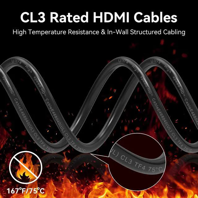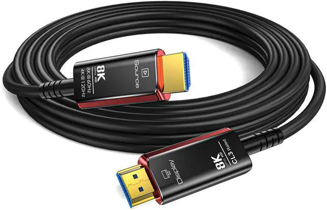 HDMI 2.1 Cable: HDMI 2.1 cables are made of optical fiber material, antiinterference and durable. Supports 8K@60Hz, 4K@120Hz UHD display and 48Gbps bandwidth. ^^ CL3 Rated HDMI CableThe 8K Fiber Optic HDMI Cable with durable PVC jacket and strain relief, CL3 Rated cable for walls, floor, ceilings, ducts, conduits. Ideal for commercial environments and home office. ^^ Smart Chip, One-way
