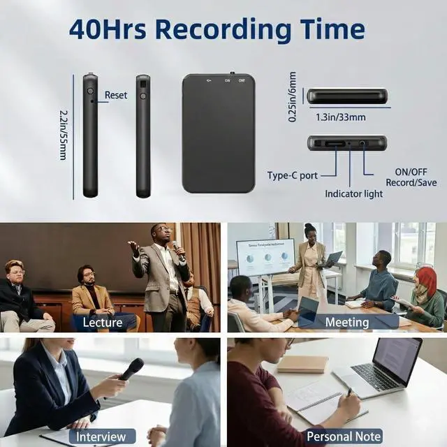 Hours: Only 0.21 in thin and 22g lightweight, yet incredibly powerful. Enjoy up to 35 hours of continuous recording and 30 days of standby time. Supports 128GB memory, storing up to 9, 800 hours of audio (32kbps) perfect for long lectures, meetings, interviews, and daily notes with zero space anxiety ^^ AI Noise Cancellation for