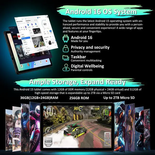 POWERFUL PERFORMANCE: Equipped with 36GB RAM and 256GB ROM (expandable up to 2TB), powered by T7200 Octa-Core processor for smooth multitasking ^^