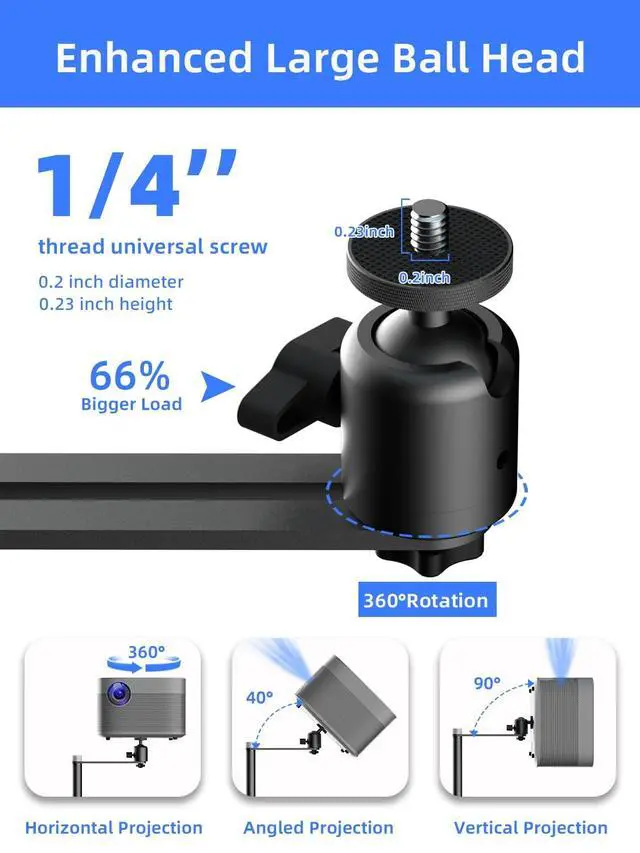 Upgraded Large Ball Head- Made with high-quality carbon steel and a stainless coating, the suptek Projector Stand is designed to provide a stable and durable solution for mounting your projector. Thickened 28mm diameter steel pipe, offers superior support and stability. The Upgraded Large Ball Head ensures stability and can support a loading capacity of up to 11 lbs. ^^ 360 Rotation- The projector stand comes with a high-quality ball head that allows for a 360 horizontal rotation and 90 tilt. This provides the flexibility to project from any angle, including upwards on your ceiling.