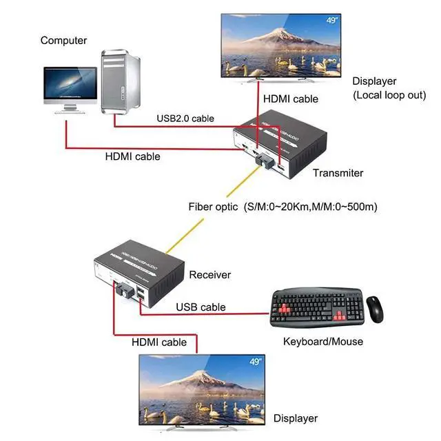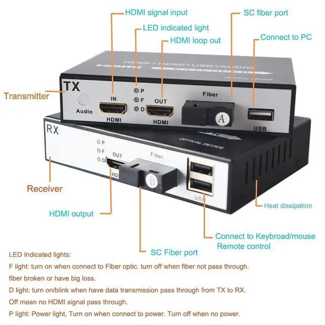 Package contents: 1x HDMI transmitter1x HDMI receiver1x 3m SC/SC S/M fiber patch cord2 x power AC100~240V DC5V/5A (US standard plug) 1 x User manual