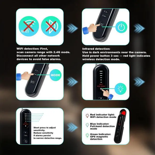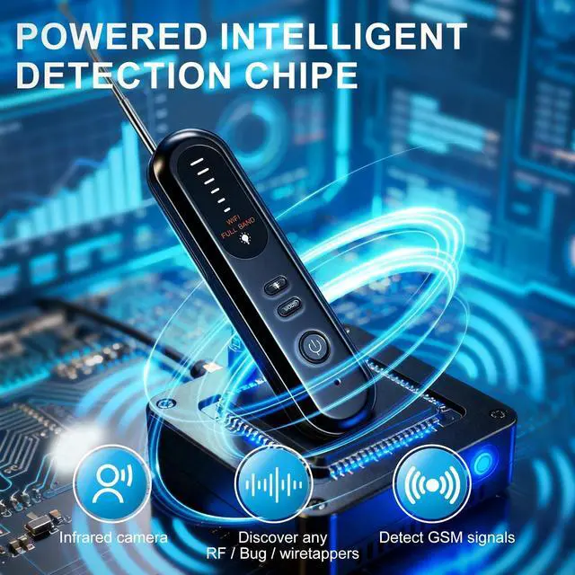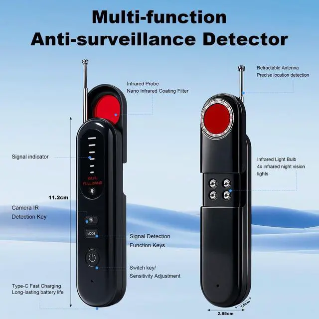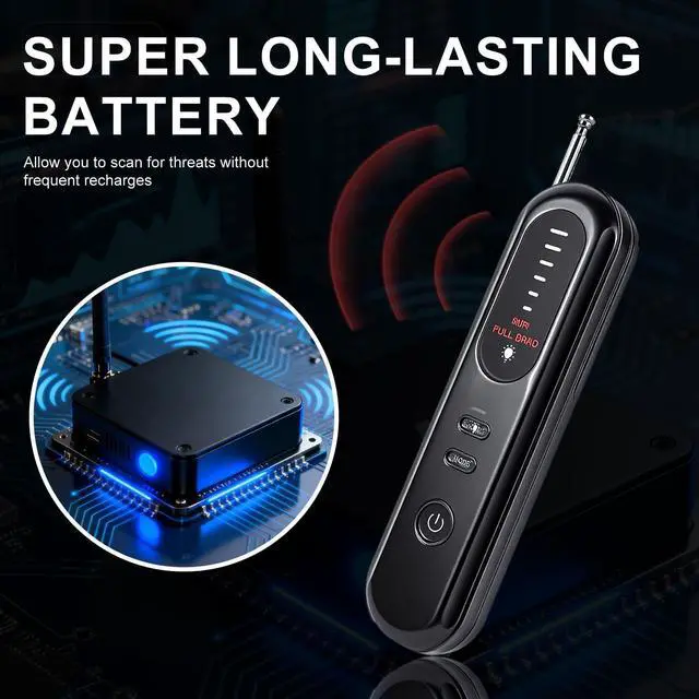 ^^ Advanced Detection Technology: Features newly upgraded high-sensitivity smart chips, infrared night vision (4 LEDs), a nano infrared coating filter, and a wide receiving frequency range for rapid, accurate identification of hidden wireless cameras and devices.
