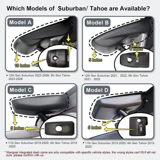 PLEASE CHECK YOUR MODEL CAREFULLY THE WRONG MODEL CANNOT BE INSTALLED SUCCESSFULLY. Several buyers were unable to install it properly because they bought the wrong model. Seriously compare THE SECOND PICTURE and THE FIRST PICTURE of Product Description. If you are still not sure which model is suitable for your vehicle style, please contact us at any time. Please take a photo of your original car sensor cover. and send it to us, and we will confirm it for you. ^^ Custom fit for Chevrolet Suburban/TahoeMangoal 4k dash cam can fit perfectly behind the rear view mirror like original.