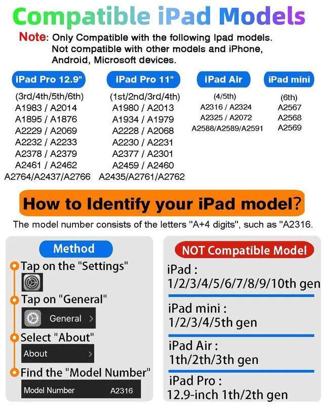 How to Identify your iPad modelTap on the "Settings"-- tap on "General"--Select "About"--Find the "Model Number". Or you can also look up the Model Number on the back of the iPad. The model number will typically start with the letter "A" followed by four numbers. For example, it may look like "A1983. " This model number uniquely identifies your iPad model. ^^ Compatible ModelsiPad pencil 2nd generation is suited for the Pad Air (4th/5th Gen), iPad Mini 6th Generation, iPad Pro 11"(1st/2nd/3rd/4th Gen), iPad Pro 12.9" (3rd/4th/5th/6th