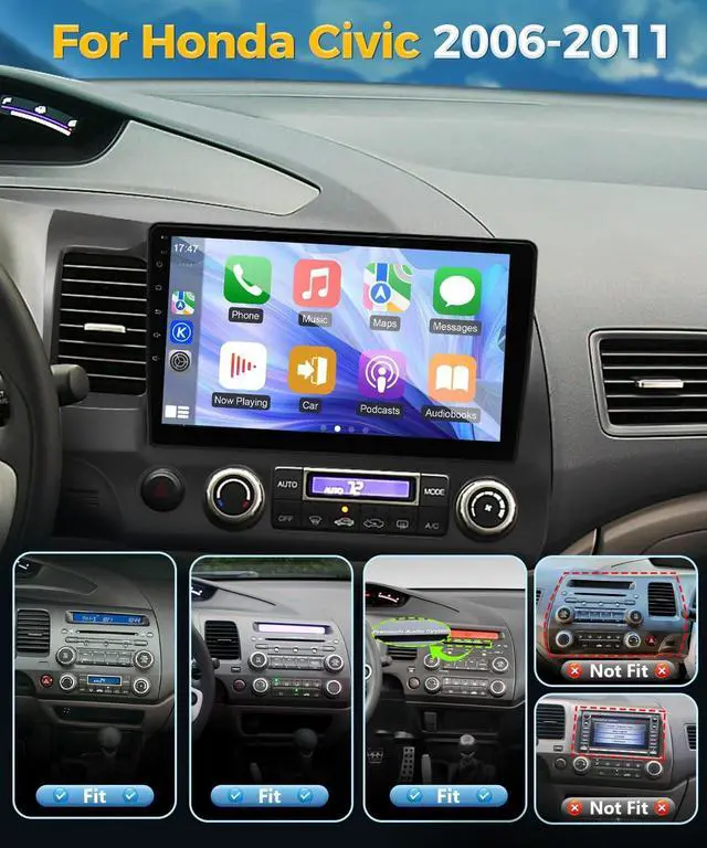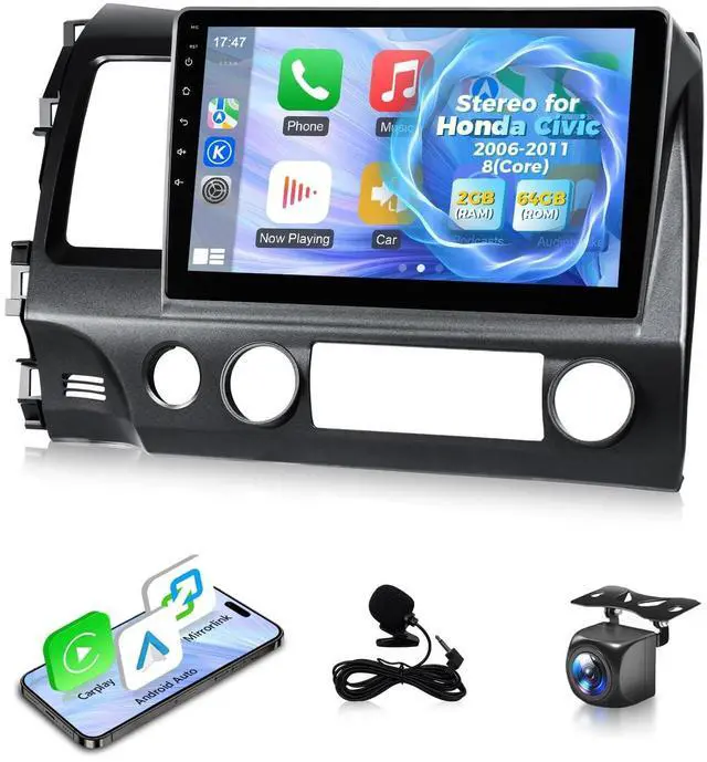 Car Stereo for Honda Civic 2006-2011 This Android radio for Honda Civic 2006 2007 2008 2009 2010 2011 stereo without J-B-L Audio System and Large Screen, no need to purchase additional accessories. 10.1 inch 2.5D HD touch screen, Android 13 system, offline/online GPS navigation, 5G WiFi connection, FM RDS radio and DSP, EQ adjustable, waterproof AHD rear view camera, 8 Core and 2G RAM and 64G ROM, steering wheel control ^^ Wireless/Wired CarPlay & Android Auto For 2007 Honda Civic radio, the wireless connection to iPhone or Android phones enables you to seamlessly use navigation apps like Google Maps and Waze, and music apps like Spotify and Pandora.