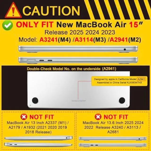 • Case Only Compatible for New MacBook Air 15.3-inch (diagonal) 2026 2025 2024 2023 release with M5/M4/M3/M2 Chip Model number:A3448/A3241/A3114/A2941. NOTE: Please check the model number "Axxxx" on the back of your laptop before purchase to ensure a perfect fit.