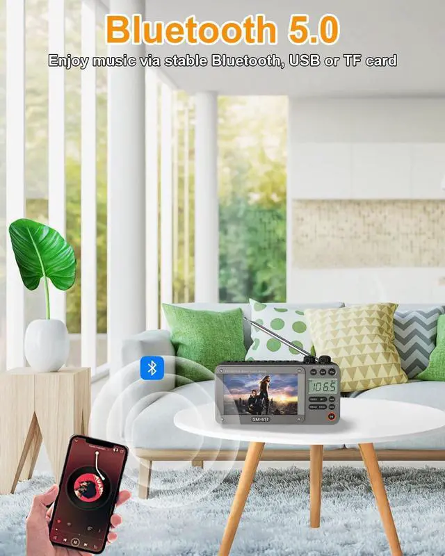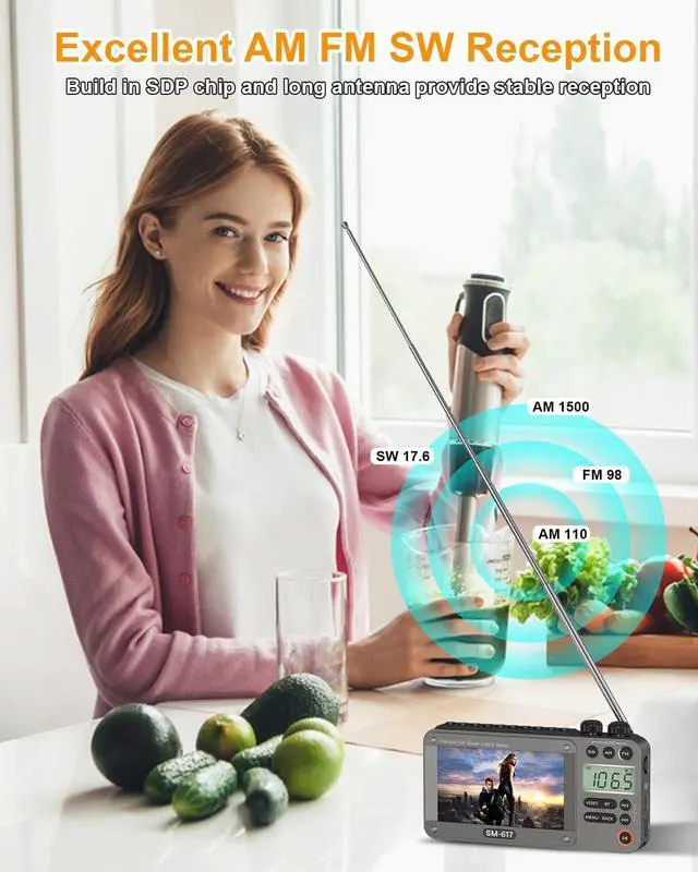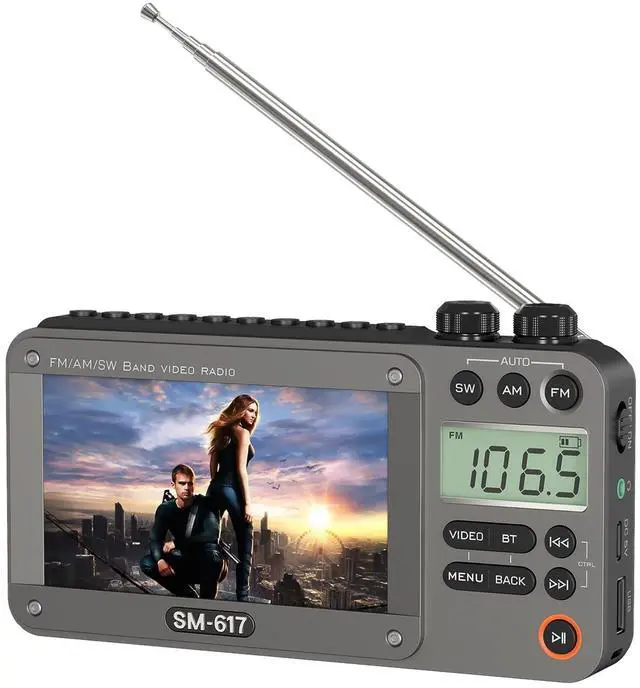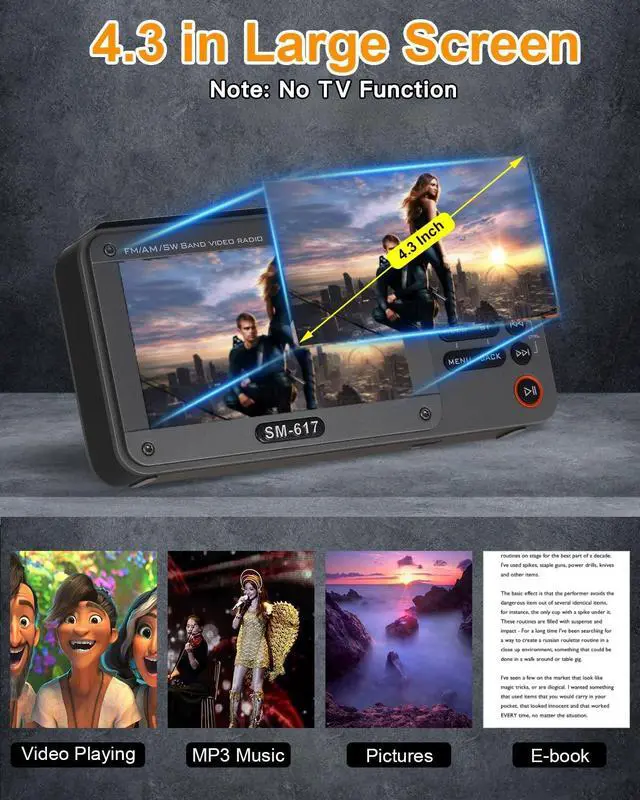 Note: NO TV Function ^^ High-Definition ViewingEnjoy your favorite movies and videos with stunning clarity on the 4.3 inch screen that supports 720p, 1080p high-definition video playback. Compatible with RM, AVI, MKV, FLV, MPG, MP4, DAT, MOV, 3GP and other video formats. Simply connect your USB or micro SD card to access your media files, making it perfect for on-the-go entertainment during road trips or outdoor activities. ^^ Reliable Reception Plus BluetoothThis portable digital radio features outstanding reception capabilities (AM 520-1710 KHz, FM 87-108 MHz, SW 3.0 - 21.95 MHz) with a long antenna and advanced DSP chip, ensuring you can tune into your favorite stations with ease. With Bluetooth 5.0, you can effortlessly stream music from your phone or computer. ^^ User-Friendly FunctionalityThe portable digital radio is equipped with automatic/manual station search and auto storage, plus number keys for direct frequency input, making it easy to access your favorite stations and tailor your listening experience. ^^ Superior Sound QualityFeaturing a high-performance speaker that delivers loud and clear sound, our digital radio am fm ensures that every note is crisp and resonant, perfect for filling any room.