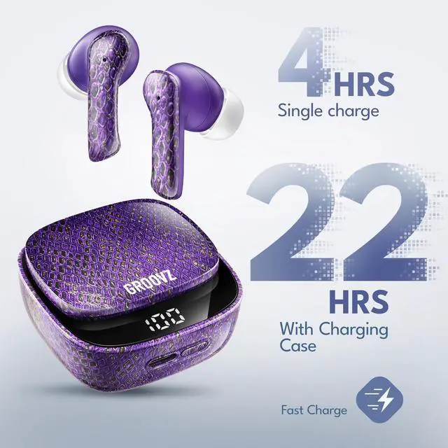 ^^ Crystal Clear Conversations: Communicate seamlessly with dual microphones featuring advanced noise reduction, ensuring every word is heard even in busy environments. With Groovz wireless earbuds, experience clear sound on both ends of the call. ^^ Battery Life at a