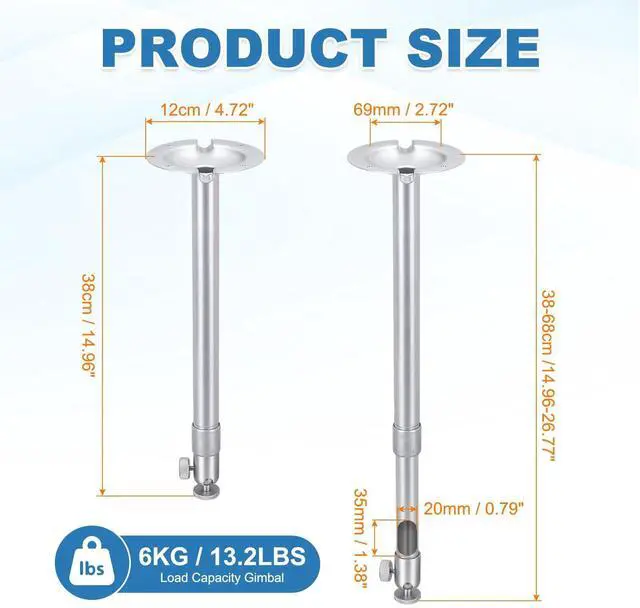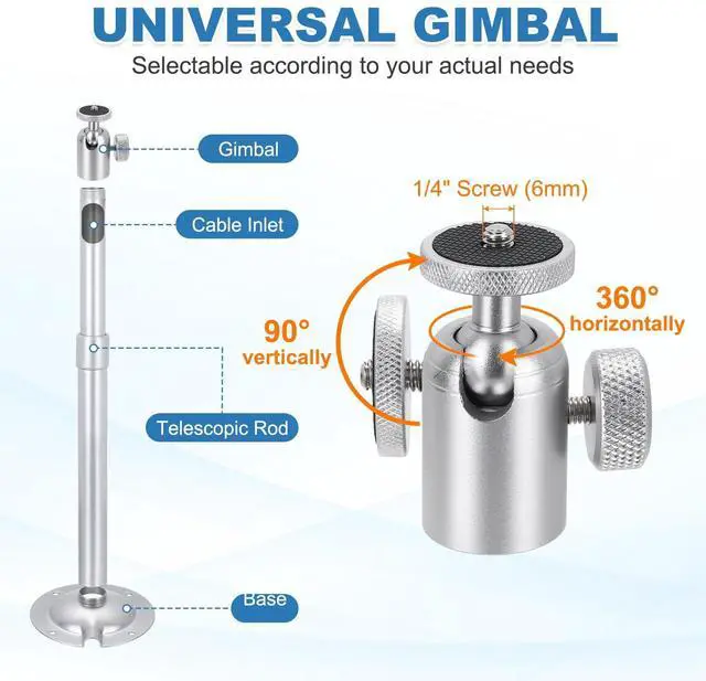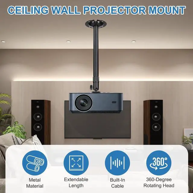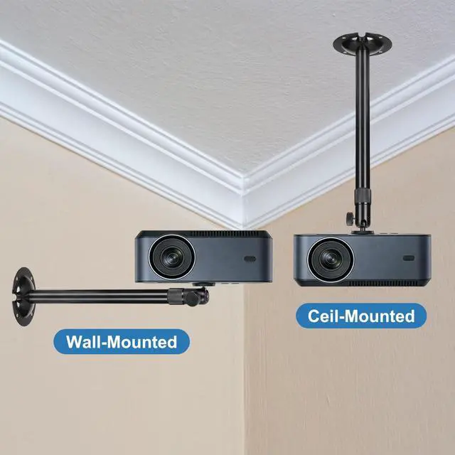 Load Capacity GimbalInstallation Method: Ceiling Mounting/Wall MountingIn the package of: 1 x Wall-Mounted Projector with Set of Mounting Hardware(Base x 1 + Gimbal x 1 + Large and Small Tube Brackets x 1 + Expansion Tubes x 4 + 3 mm Screws x 4)Are there any advantages to the product? The projector mount provides a stable and secure solution for ceiling-mounted projectors. Its adjustable length and 360-degree rotatable ball head allow for precise positioning. The design features internal cable routing for a clean, organized setup. The universal design fits most projectors with a 1/4"screw thread mounting hole, and the robust construction helps minimize shake for a steady picture. How to use it? Mount the plate to your projector, install the base on the ceiling, then connect and adjust the height and angle. Tighten all knobs to secure the position. What should I notice? Confirm your projector's mounting hole thread type (1/4 inch) and ensure its weight is within the mount's capacity before purchase. Always install into a ceiling structure that can safely support the combined weight.