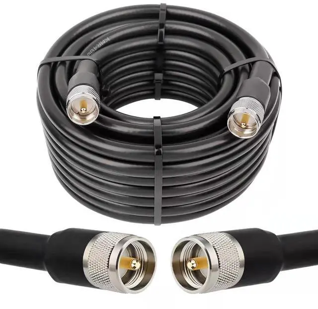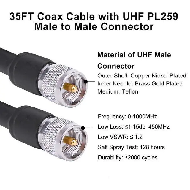 LOW LOSS - The loss of 35ft KMR400 pl259 coaxial cable at 450MHZ signal frequency is less than 1.11 dB and the SWR 1.25. It is a low loss uhf coax cable with PL259 plugs on the both ends. There is no need to worry about signal loss for long-distance high-frequency use. ^^ Well Built Structure- The inner conductor of this pl259 cable is made of copper clad aluminium, and the outer conductor is made of Aluminum foil and tinned copper braid which could maximum protect the signal over large distance. This KMR400 coaxial cable is equivalent to lmr400 and rg8u.
