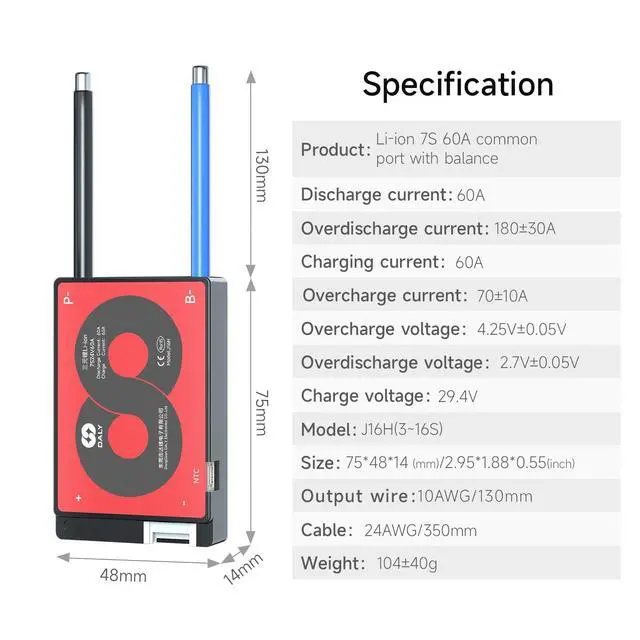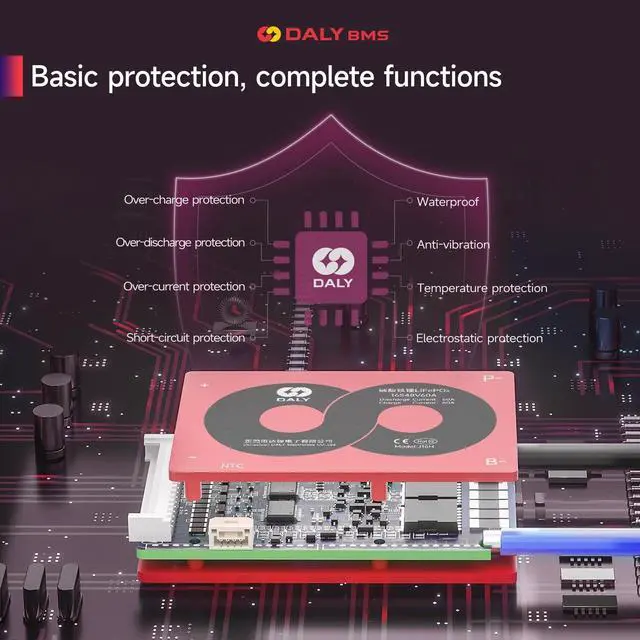 DALY BMSAdopt injection molding sealing process, with dustproof, shockproof, waterproof, anti-accumulation function ^^ Multi -Function ProtectionOver-charging, Over-discharging, Over-current, Temperature and Short-circuit protection functions. --- ISO/ FCC/ RoHS/ PSE/ CE APPROVED ^^ New UpgradeSmaller size; Low temperature rise; Consistent Chg/Dischg cuurrent. ^^ Easy to installEasy to plug and unplug, which allows you to effortlessly create an electrical connection between the battery pack and the BMS. ^^ NoteStandard BMS dosen't have communication functions. If you need smart BMS, active balancer, parallel module or other accessories, please contact online customer service.