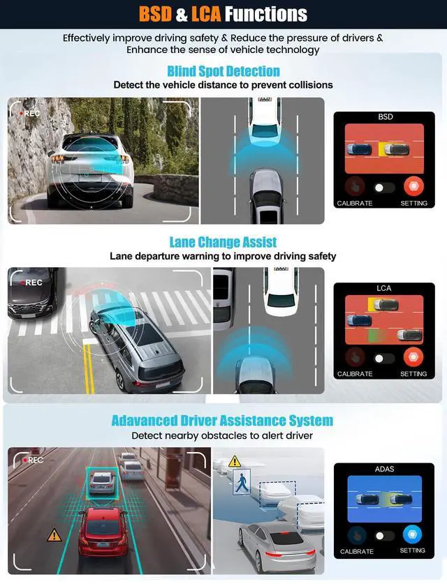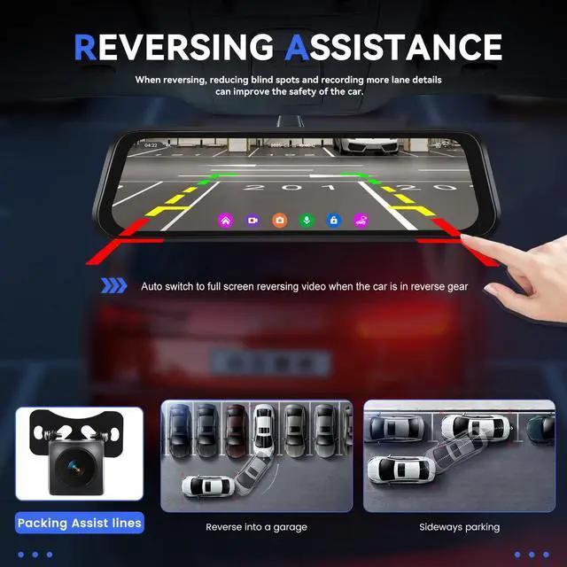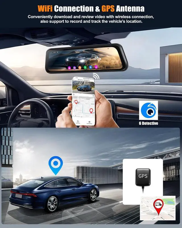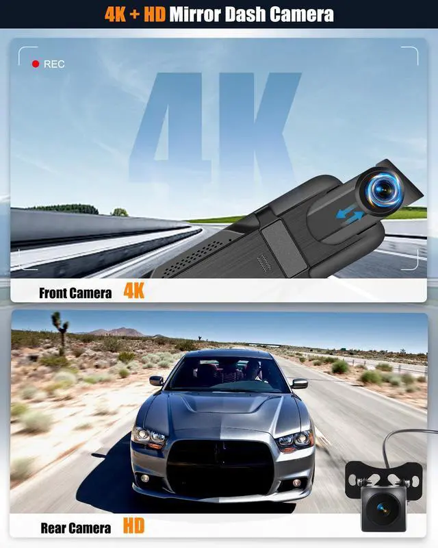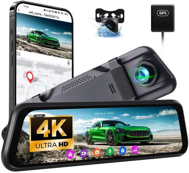 [4K FRONT & HD REAR - MIRROR DASH CAMERA] - Equipped with 4K front camera with 150 wide view angle, 1080P waterproof backup camera with 120 viewing angle, can record clear video in front and behind the car simultaneously, real-time transmission of images, capture license plates from a distance, never miss the road status and details when driving ^^ [ 9.66 '' IPS STREAMING MEDIA FULL TOUCH SCREEN] - 9.66 inch IPS screen provides excellent visibility from any angle. Streaming media full touch screen by simpler operation: switch front and rear camera images by swiping left and right, adjust the viewing angle by swiping up and down, video recording/playback, split screen ^^ [SUPER NIGHT VISION & PARKING ASSISTANCE] - The upgraded 4K front camera and HD 1080P backup camera presents clear videos in low light conditions with super night vision and enhanced details such as license plate number and road signs. The reversing camera offers adjustable guide lines to assist you park safely ^^ [BUILT-IN WI-FI & GPS ANTENNA] - This rear view mirror camera comes with an APP for Android or iOS smartphones, you can preview the real-time image through the built-in Wi-Fi connection. With the external GPS antenna, view the GPS info and ccurately trace back all the GPS metrics in playback recorded videos on GPS Player ^^ [ADVANCED ADAS & BSD & LCA] - Enhances safety through Advanced Driver Assistance System alerts, including collision warning, pedestrian collision warning, lane departure warning, forward vehicle start warning, and distance monitoring. Provide real-time blind spot monitoring, alerting you to potential rear-end collision risks, LCA function enhances safety during lane changes ^^ [LOOPING RECORDING & G-SENSOR] - Seamlessly Loop Recording, continuously recording and overwriting the oldest footage with the newest upon filling a card to capacity (TF card is not included).