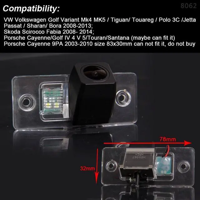 Car rear view backup camera Replacemnt for VW Golf Variant Mk4 MK5 / Tiguan/ Touareg / Polo 3C /Jetta/Passat / Sharan/ Bora 2008 2013; Skoda Scirocco Fabia 2008- 2014; ^^ HD 1280*720 pixels 1000TV lines 170 degree visible range works great with the blind spot. ^^ IP68 waterproof, shockproof and night vision. It also can get clear, low-noise and high-quality image even in rainy weather, high-pressure car wash and in dark environments. ^^ 170 wide view angle can meet your vision needs when driving or parking, adjustable camera lens allows you to find the best position, makes you drive safely.