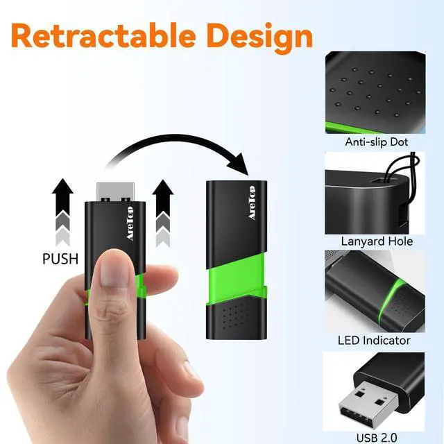 RETRACTABLE DESIGN: The flash drives 5 pack are made from superior ABS plastic. The glide style makes usb drive easy to use and protects the connector from damaging, don't worry about losing the cap. Anti-slip wave dot design at Push-Pull position makes it convenient for you to hold and plug ^^