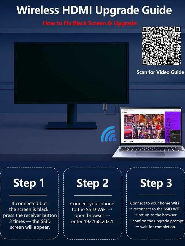 Vswherever you go. ^^ Cross-Platform Compatibility: This portable Wireless HDMI Dongle Adapter supports Airplay for iOS/macOS and Miracast for Android/Windows, eliminating the need for a traditional receiver. This feature allows seamless device switching during presentationssimply disconnect one device and let another easily project without needing to pass the transmitter. Perfect for business presentations and classroom settings, it ensures hassle-free connectivity for multiple users. ^^ Update Steps for Black Screen (Win 10/11 or iPhone 17): 1.Triple-press receiver button to display SSID. 2.Connect phone to the SSID, then visit 192.168.203.1. 3.Select first option to connect to your home Wi-Fi > Reconnect phone to SSID > Return to the address > Confirm upgrade > Wait for completion.
