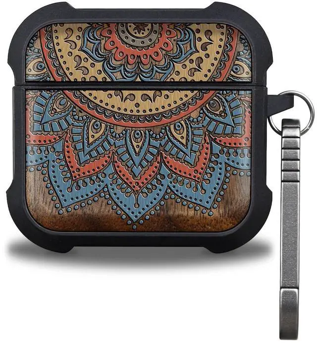 Patterit for AirPods 4 Case (2024) (USB-C), Shockproof Cover with Quick Released Keychain, Compatible with AirPods 4th Generation, Natural Wood Hand-Drawn (Sunburst Mandala) Walnut