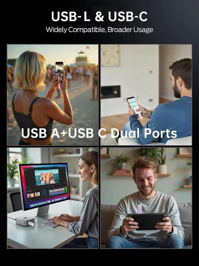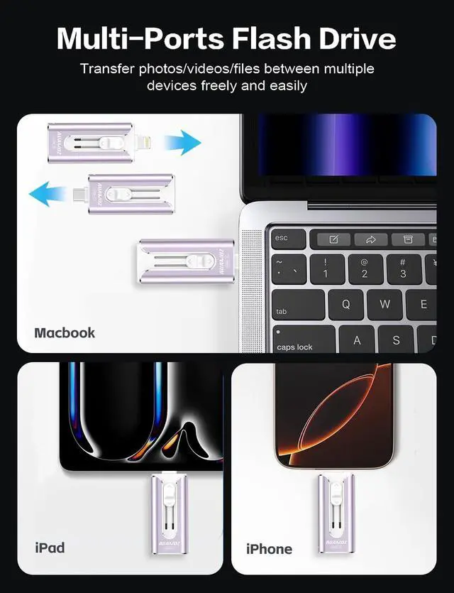 (Note: For iPhone/iPad No App Required; For Android only Needs OTG Enabled, No Extra App. ) ^^ Universal Compatibility with Dual InterfacesFeaturing USB-C, USB-L, USB ports adapter, this Compatibility iPhone photo storage stick connects seamlessly with iPhone/iPad devices, Android OTG phones, laptops, and tablets. No iCloud fees, no internet requiredjust plug in and move files freely between your phone, computer, and other devices. ^^ Blazing Fast Transfers AnywhereFeaturing upgraded high-speed chips, this portable phone external storage drive enables instant mass file transfersup to 30 MB/s read speed and 15 MB/s write speedno WiFi or data cables required. Save time sharing photos, moving large video projects, whether youre traveling, working, or creating content on the go. ^^ Easy Backup, Enjoy Anytime AnyplacePlug-and-play & simple to operatequickly back up videos, photos, contacts and documents without tedious copying or pasting. No third-party apps required; just plug the drive into your iPhone, iPad or Android device and operate via the "Files" app. You can also share files directly from the iPhone photo stick to social media, instantly sharing wonderful moments with friends and family.