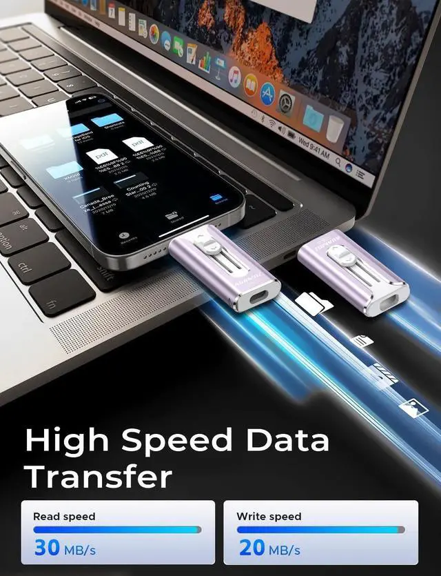 Higher: Simply insert the flash drive into your iPhone iPad, then go to the "Files" app, Click back to Browse and find the flash drive named Untitled, Move photos videos and files to your iPad or iPhone as needed. ^^ How to transfer in Android PhonesAndroid phones need to support OTG, and flash drives can be found in the File Manager of most Android devices. ^^ Kindly NoteThe phone case may prevent the proper connection between a phone and a usb flash drive, which could result in the phone being unable to recognize the usb flash drive. In this situation, please do not conclude that the usb flash drive cannot be used, remove the phone case and try again. ^^ Kindly NoteFor Flash Media Devices, 1 megabyte = 1 million bytes; 1 gigabyte = 1 billion bytes. Actual useable capacity may vary. Some of the listed capacity is used for formatting and other functions, and thus is not available for data storage. ^^ Kindly NoteUp to 30MB/s read speed, write speed is lower. Based on internal testing; performance may be lower depending on the host devices and users settings and configurations.