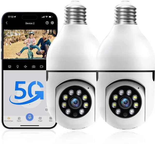 5/2.4GHz Bual Dand Wifi Light Bulb Camera: The latest 5G & 2.4G dual-band light bulb security cameras wireless outdoor have stronger signal reception, higher stability, longer distance to use, no lag and smoother real-time video compared to traditional 2.4G single-band lightbulb security camera. Simply screw the best light socket security camera into the equipped E27/E26 bulb base (AC110/240V) and plug it into a power outlet, connect camera light bulb to your home wifi via AJCloud app.