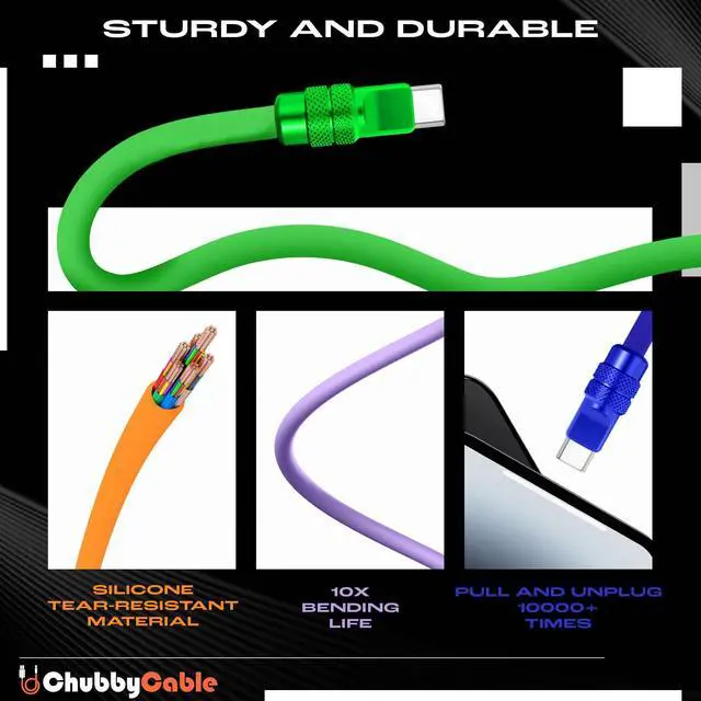 DURABLE & THICK SILICONE BUILD: Built to last, the ChubbyCable fast charger cord uses a premium 5.6 mm thick silicone jacket for exceptional flexibility and durability. The smooth-touch silicone resists dust, tangles, and daily wear, while the reinforced zinc-aluminum alloy connectors prevent rust and breakage ^^